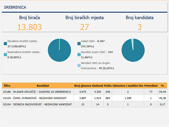 Aktuelni načelnik opštine Srebrenica Ćamil Duraković izjavio je za federalne medije da je kandidat srpskih stranaka za načelnika Srebrenice Mladen Grujičić pobijedio na lokalnim izborima, ali I najavio da mu ostaje mogućnost žalbe na odluku Centralne izborne komisije . Prema danas objavljenim podacima na internet stranici Centralne izborne komisije BiH...