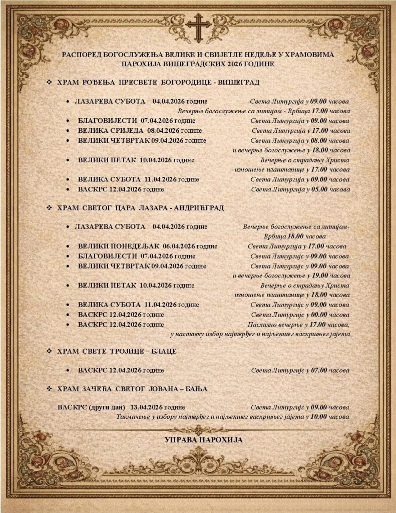 HomePRAVOSLAVLjERaspored bogosluženja za Vaskršnje praznike apr. 02, 2026 at 8:45 pmPRAVOSLAVLjERaspored bogosluženja za Vaskršnje praznike4 sedmice ago14. Aprila 2026.PRAVOSLAVLjE553 views Tags :pravoslavljetweet POGLEDAJTE JOŠAktuelnosti VišegradPRAVOSLAVLjERogaticaNa Sjemeću će biti izgrađena crkva brvnaraPRAVOSLAVLjESPC proslavlja drugi dan Vaskrsa – Vaskršnji ponedjeljakAktuelnosti VišegradTradicijaANĐELA BABIĆ POBJEDNICA SEDME VASКRŠNJE TUCIJADEPRAVOSLAVLjESvijetPutinova čestitka: Vaskrs je simbol pobede života, ljubavi i pravdePRAVOSLAVLjEPatrijarh Porfirije u Vaskršnjoj poslanici: Bez Srba na Kosovu i Metohiji nema boljeg života ni za nasPRAVOSLAVLjEHristos vaskrse! Pravoslavni vernici danas slave Vaskrs, najveći hrišćanski praznik, dan kada je Isus Hristos vaskrsao iz mrtvih