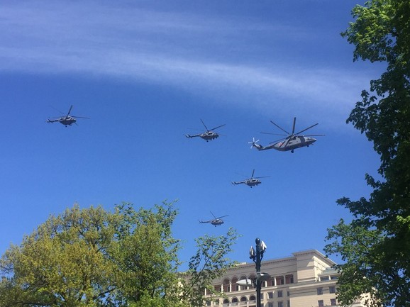 Vazdušni deo parade otvorili su helikopteri Mi-26 sposoban da u vazduh podigne do 20 tona tereta, u pratnji četiri višenamenska helikoptera Mi-8, zatim “Berkuti”, helikopteri Mi-28N „Noćni lovac”. Šestorka jurišnika Su-25 ukrašava nebo iznad Moskve ruskom trobojkom.