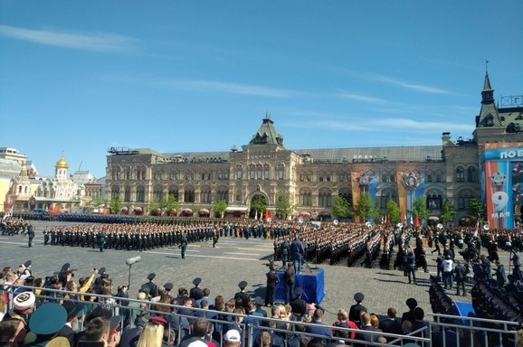 Prvi čovek Rusije čestitao Dan pobede građanima Rusije, vojnicima i oficirima, rekavši da će je to sveti praznik za čitavu zemlju, praznik opštenacionalnog ponosa. Putin je potom rekao da je podvig Sovjetskog saveza u Drugom svetskom ratu došao uz brojne žrtve.